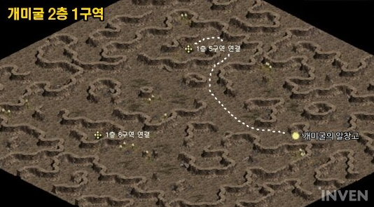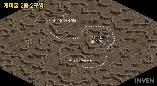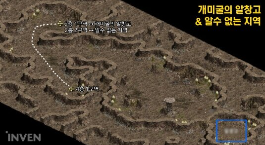 2층 2구역 미로가 매우 복잡해지는 구간입니다. 길을 잃기 쉽지만, 일단 자리를 잡으면 몬스터 밀집도가 높아 시간당 경험치 효율이 개미굴 내에서 손꼽히는 수준입니다.